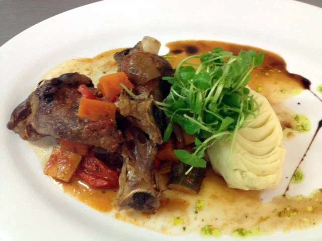 In a pot, brown the lamb shanks in oil. Add onion, celery, carrot, rosemary, thyme, parsnip, red pepper, garlic, courgettes. Cover with beef stock, add tomatoes and tomato paste. Mix brown sugar and balsamic into the sauce. Cover and simmer for approx 2hrs until the lamb shank is tender. Serve with creamy mashed potato.